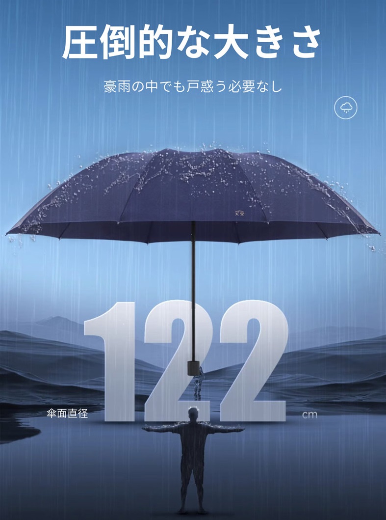 商品解説 ●コンパクトな折り畳み傘なのに、開くと120cmのビッグサイズ。 全身をすっぽり覆えるので、足元やリュックも。