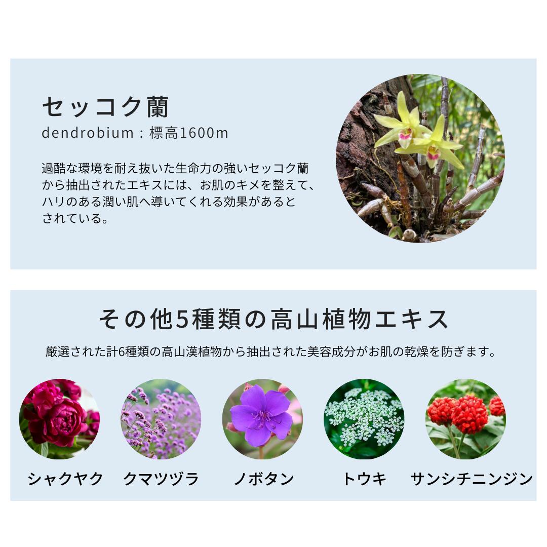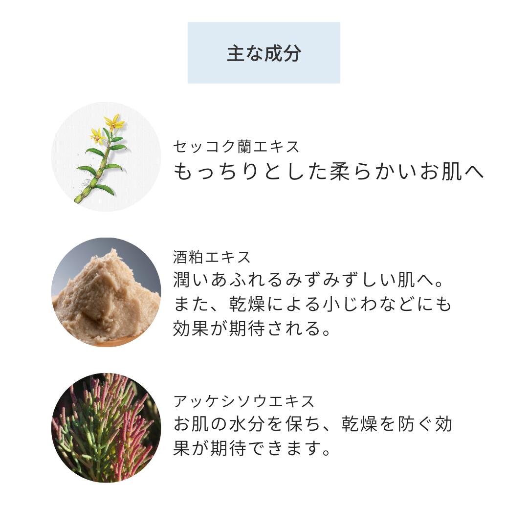 水、BG、グリセリン、ペンチレングリコール、イソステアリン酸PEG-25グリセリル、スクワラン、水添レシチン、ラウロイルグルタミン酸ジ(フィトステリル/オクチルドデシル)、オーキッドエキス、トウリンドウエキス、カラトウキ根エキス、クマツヅラエキス、サンシチニンジン根エキス、シャクヤク根エキス、ノボタンエキス、ボスウェリアセラタ樹脂エキス、シーウィップエキス、アッケシソウエキス、酒粕エキス、PEG-90M、キサンタンガム、カルボマー、水酸化K、EDTA-2Na、ラウリルベタイン、プロパンジオール、カプリルヒドロキサム酸、香料