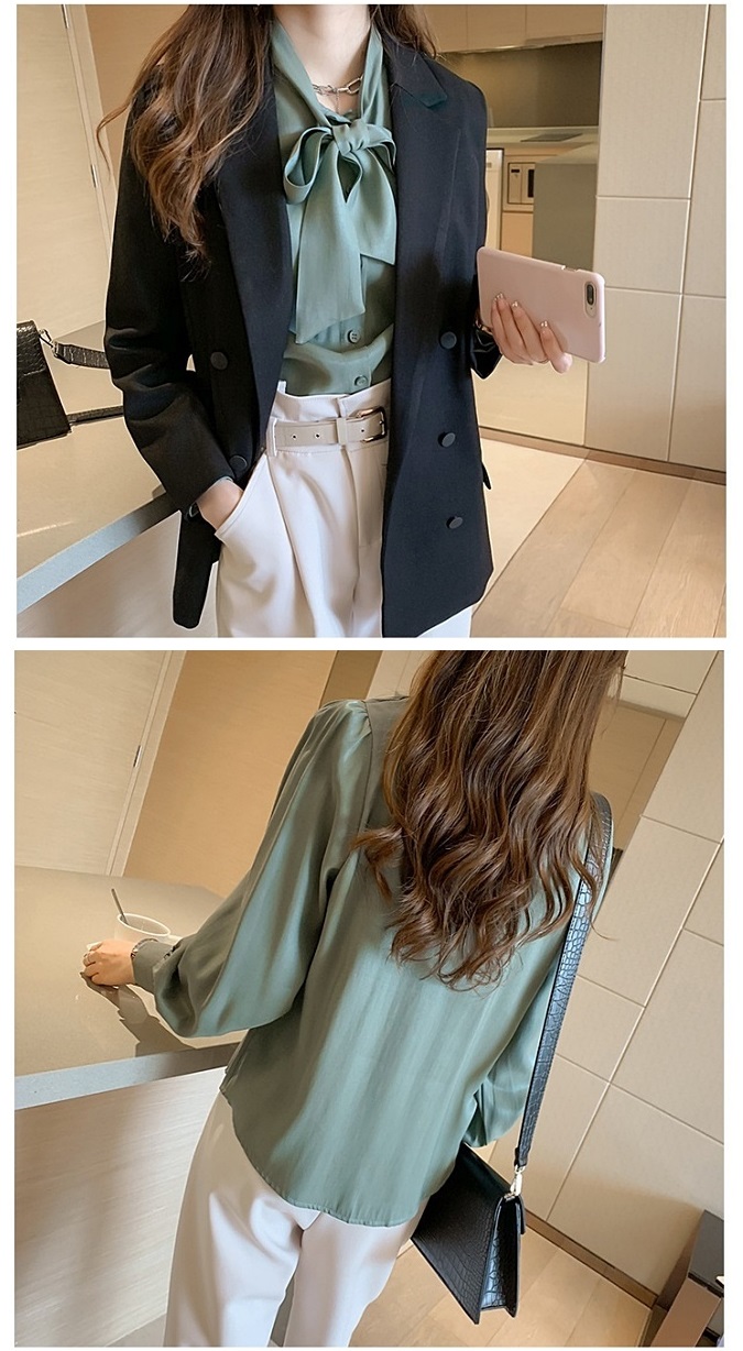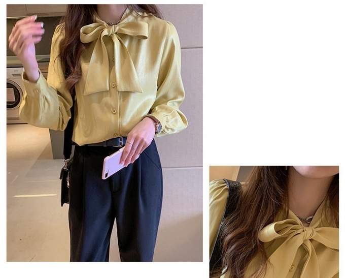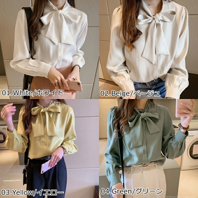 韓国 ネクタイ シャツ ブラウス リボン サテン 光沢感 トップス レディース 白 ベージュ イエロー グリーン M L LL エレガント フォーマル 長袖 上品 OL 春 無地