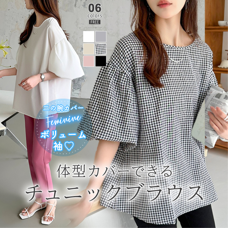 バルーンスリーブ 裾 半袖 オフィス カジュアル 上品 きれいめ おしゃれ 春 夏 トップス 五分袖 バルーンスリーブブラウス レディース バルーン袖 ボリューム袖 パフスリーブ aライン ラウンドネック 二の腕カバー