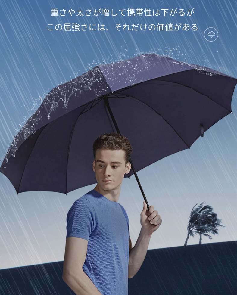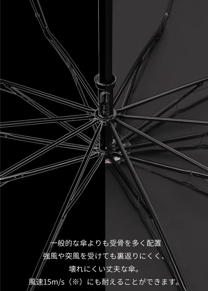 ●濡れにくい。さらに耐久性の高い12本傘で、頑丈な作りになっている。重さや太さが増して携帯性は下がるが、この屈強さには、それだけの価値がある