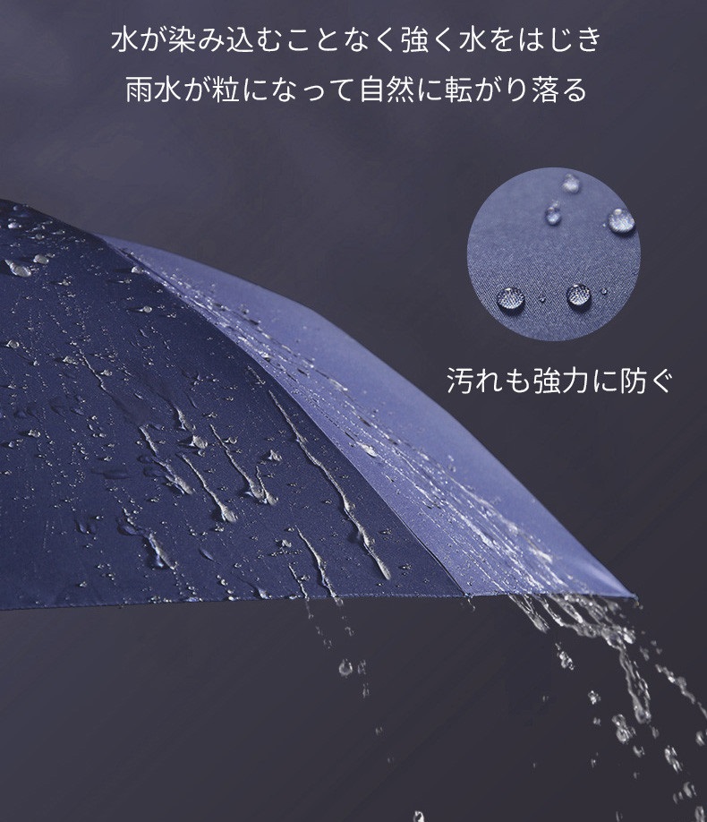 ●傘が水を防ぐのは当たり前と思いがちですが、 撥水性により優れた傘は傘表面に水が溜まらずに転がり落ちて行くので、 表面は常に乾いた様な状態を保てます。