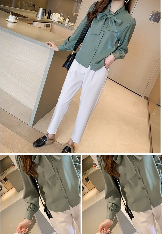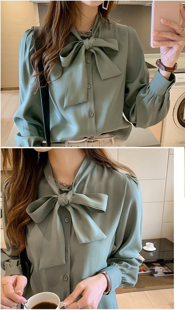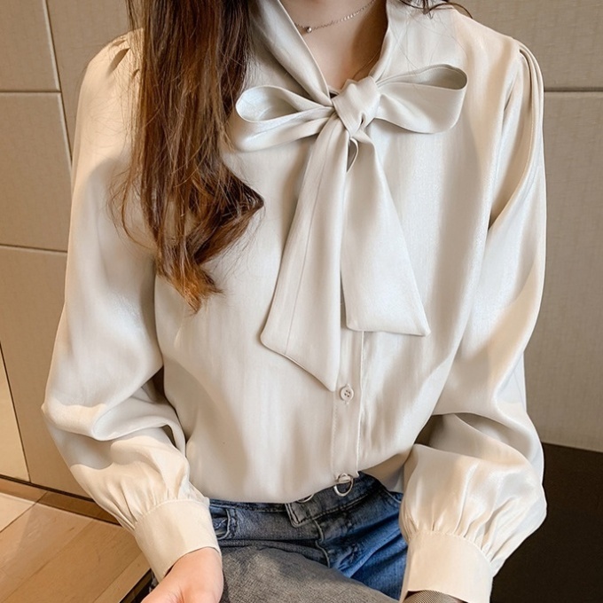 韓国 ネクタイ シャツ ブラウス リボン サテン 光沢感 トップス レディース 白 ベージュ イエロー グリーン M L LL エレガント フォーマル 長袖 上品 OL 春 無地