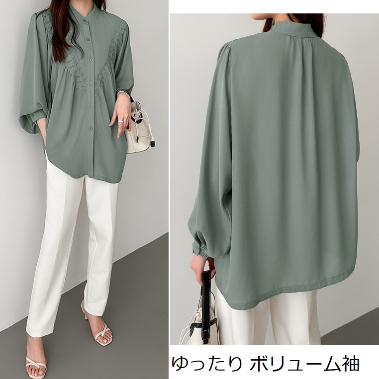 ぽわん袖が可愛い シフォンブラウス トップス レディース 長袖 バンドカラー シャツ シャツブラウス シフォン オーバーサイズ ボリューム袖 ロング バンドカラーシャツ 体型カバー オフィス オフィスカジュアル 大人 きれいめ 春 夏 秋