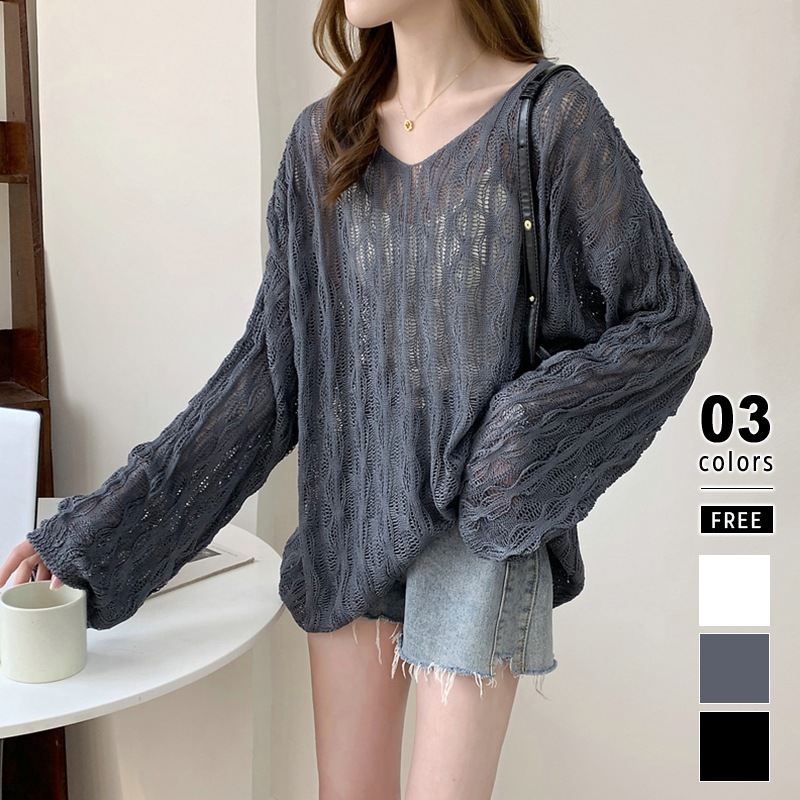 サマー ニット メッシュ ニット 透かし編み メッシュニット トップス レディース シアー 長袖 シースルー オーバーサイズ ロング 透かし編みニット Vネック 透け感ニット 重ね着 ゆったり 体型カバー